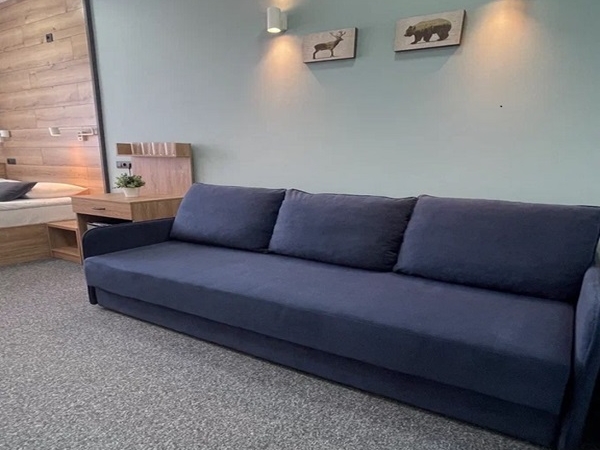Четырехместный номер с одной двухспальной кроватью и раскладывающимся диваном. В номере : шкаф, стол, стул, тумба, телевизор, гардеробная, холодильник, ковровое покрытие,WiFi. Совмещенный санузел: зеркало, фен, раковина, туалет, душ, шампунь, мыло, гель для душа.