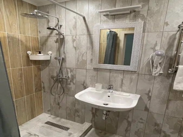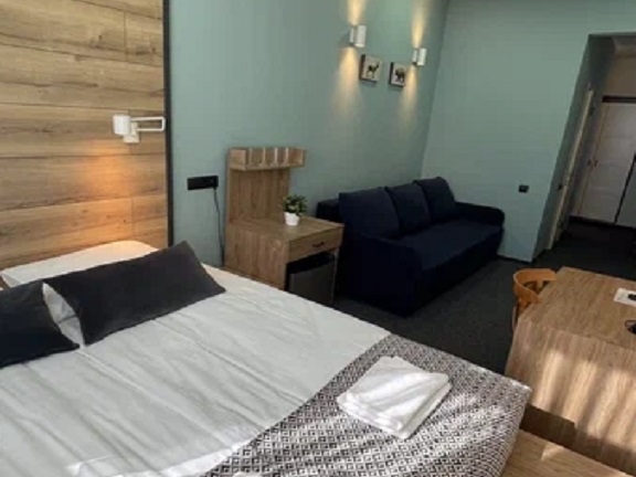 Номер категории «Улучшенный двухкомнатный» — Четырехместный номер с одной двухспальной кроватью и двумя односпальными. В номере : шкаф, стол, стул, тумба, телевизор, гардеробная, холодильник, ковровое покрытие,WiFi. Совмещенный санузел: зеркало, раковина, туалет, душ, туалетные принадлежности.