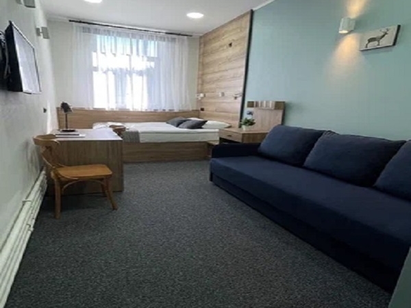 Номер категории «Двухкомнатный полулюкс» — Четырехместный номер с двухспальной кроватью, тахта, и диванчик. В номере : шкаф, стол, стул, тумба, телевизор, гардеробная, холодильник, ковровое покрытие,WiFi. Совмещенный санузел: зеркало, раковина, туалет, душ, туалетные принадлежности.